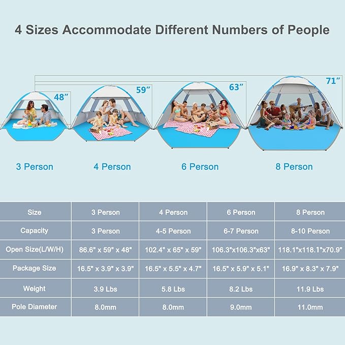 - Super Large Space: Size of 106.3"L x 106.3"W x 63"H, 30% bigger than other POP-UP tent at similar price, fits 6-7 person. It provides a comfortable space for family and friends on the beach