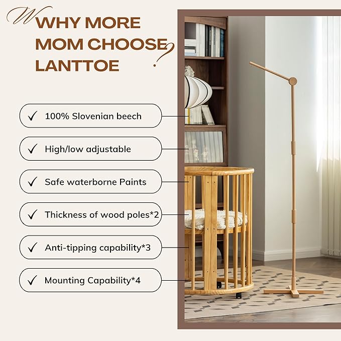- 【European Beech Wood Only】The choice of 10,000+ mothers around the world, we import the best quality natural beech from Europe, all floor-standing mobile arm are made of safe water-based paint, designed by a professional baby product design team, to ensure that every product makes mothers rest assured and babies happy.
