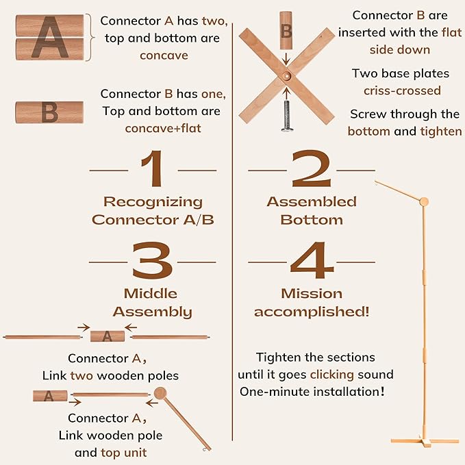 - 【Distinguish Connector A/B】In just one minute, you can easily assemble our products. All the rotating connections of the wooden poles, we recommend that you turn until the "gobble" sounds, so as to ensure the better use of our products,when not in use you can take them apart for compact storage.