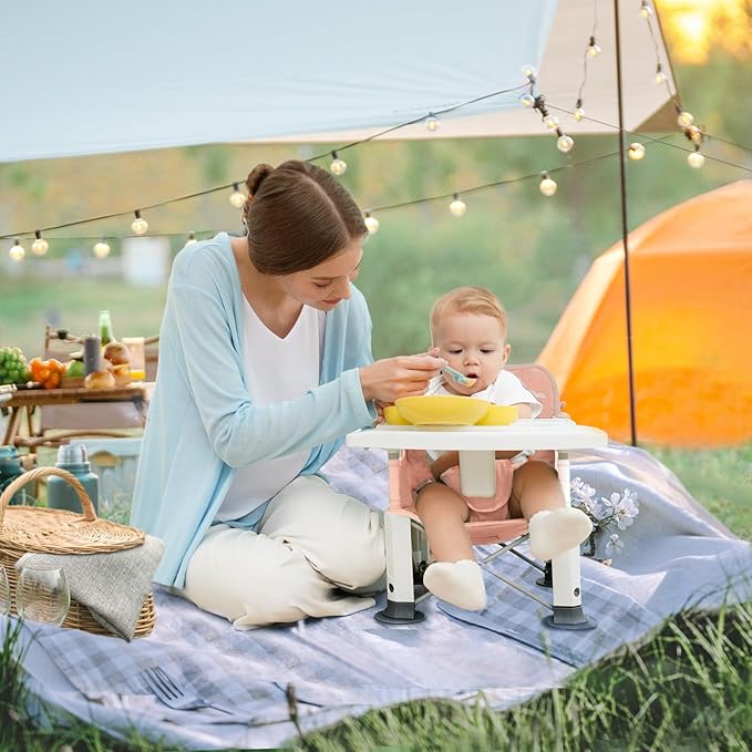 Baby Travel Booster Seat with Double Tray, BabyBond Upgraded Toddler Portable Baby Chair, Booster Seat for Dining Table, Stable and Foldable Booster Baby Chair for Indoor/Outdoor (Pink Dinosaur)
