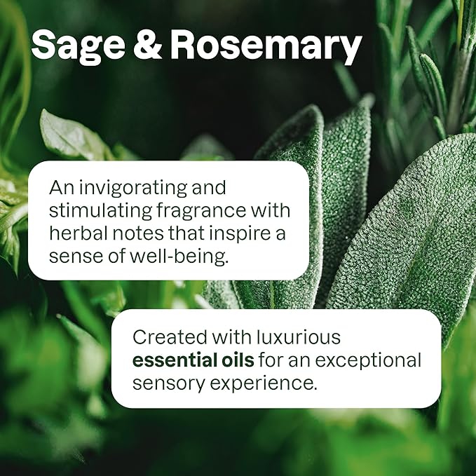 - SAGE & ROSEMARY: This fragrance features sharp, camphoraceous eucalyptus top notes, an herbal aromatic heart of lavender, rosemary, and Dalmatian sage, and a refreshing base of citrusy-floral neroli and zingy ginger for a crisp, balanced, and naturally clarifying experience.
