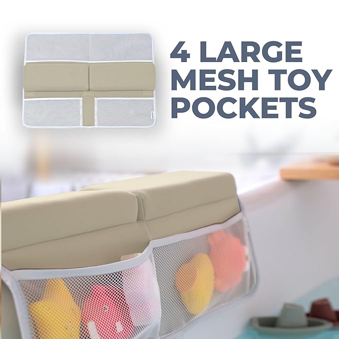 - POCKETS FOR BABY BATH ESSENTIALS: With 4 breathable organizer pockets, our bath mat for baby bath time will perfectly complement your routine. A handy solution for baby bath toys as well!