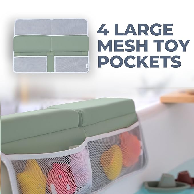 - POCKETS FOR BABY BATH ESSENTIALS: With 4 breathable organizer pockets, our bath mat for baby bath time will perfectly complement your routine. A handy solution for baby bath toys as well!