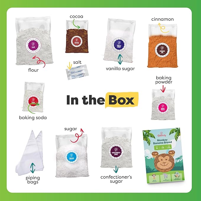 - FRESH INGREDIENTS, TASTY BANANA BREAD: Bake monkey banana bread with irresistible chocolate icing with this Baketivity baking kit featuring kosher pre-measured dry ingredients expertly crafted in the USA. A shopping list for wet ingredients is also included.