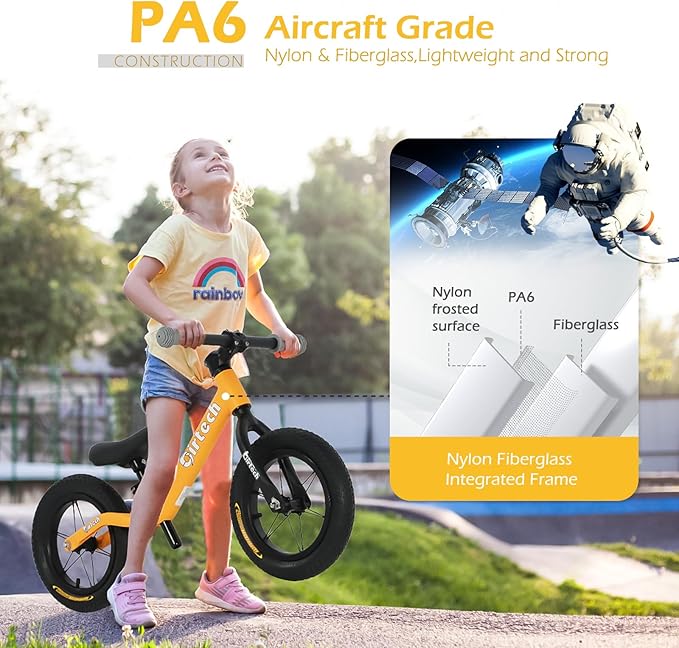 - INTEGRATED NYLON FRAME - Constructed of Aircraft Grade PA6 and fiberglass integrated molding, Frame constructed in one piece without any welding brings a smooth and beautiful appearance. The nylon frame is sturdy and lightweight., weights 6.4 lbs, the lightweight balance bike frame design makes the bike easier to control for kids.