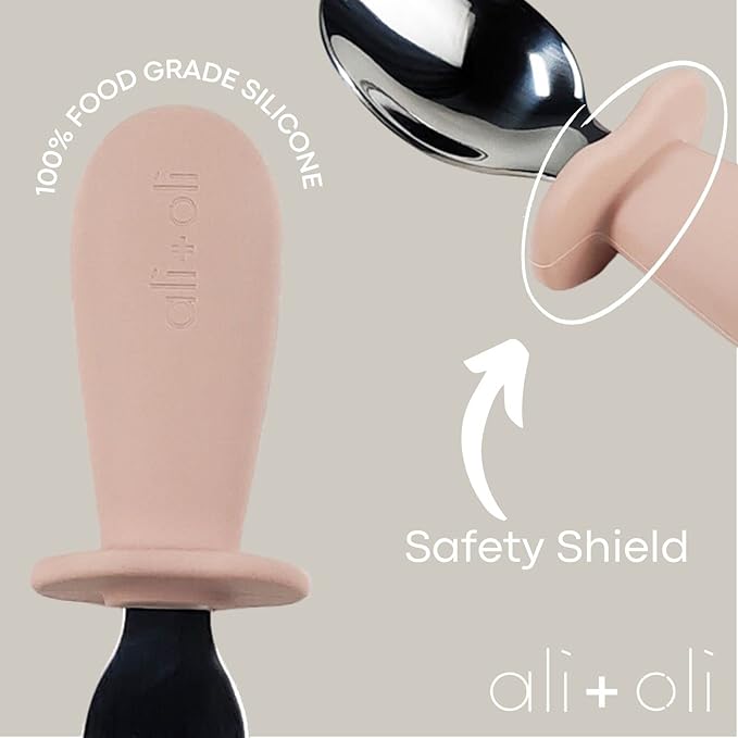 Ali+Oli Spoon & Fork Learning Set for Toddlers (Powder Pink) 6m+ Grab Easy BPA Free Food-Grade Silicone Handle, Kids Silverware Self Feeding Baby Utensil, Multi-stage Baby Feeding Set Ergonomic Design