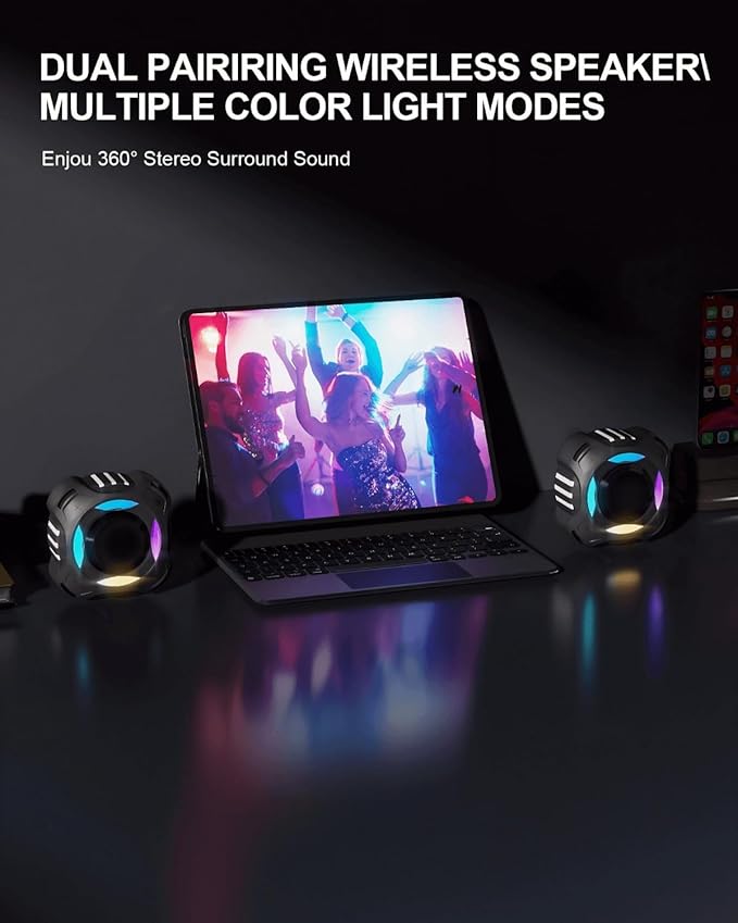- [MULTIPLE LED LIGHT MODES & A2DP BLUETOOTH 5.3]- Simply press the "Light Button" to enable the colored lights and press again to switch the light mode to make your party more fun. Start the party with powerful sounds and rock the party with multi-color flashing lights. Perfect for use in family parties and take to pool parties or beach parties. Wireless speaker uses Bluetooth 5.3, A2DP technology, which means lower power consumption, faster transmission, no delay in calls.