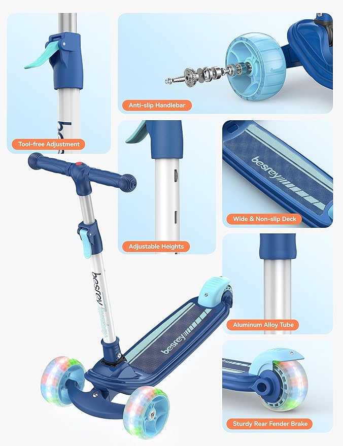 Besrey Kick Scooter for Kids Ages 3-10, 3-Wheel Folding Scooter with Adjustable Height, LED Light Wheels, Extra Wide Deck for Outdoor Activities