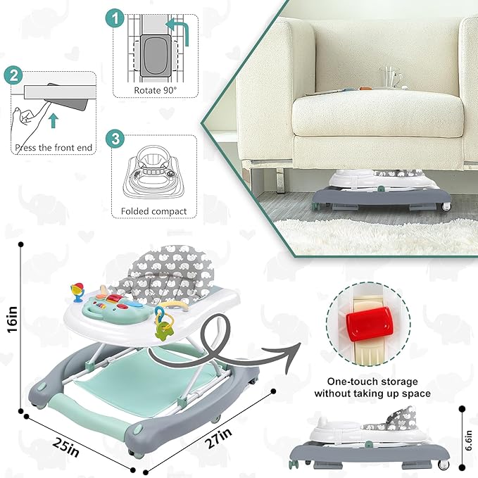 - Easy To Assemble And Fold: The baby boy and girl walker is easy to assemble and folds the walker with wheels in just a few steps, then unfolds and sits baby down; the baby girl walker can be stored under the bed or under the sofa without taking up too much space. The compact folding design makes this collapsible baby walker easy to carry around!