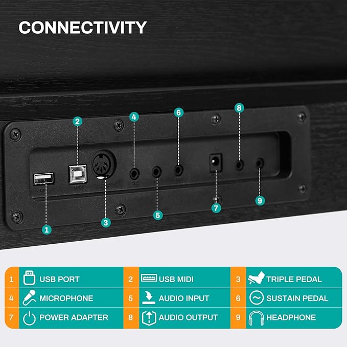 - [Powerful]: AD-X1 digital piano has great compatibility with iPad and cell phones. You can also connect a microphone with the three-pedal