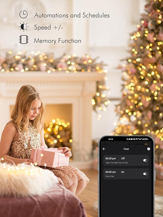 - Music Synchronization: Our Smart LED Christmas Fairy String Lights can detect and match the rhythm of your music, transforming your space into a lively, immersive environment. They adjust colors and brightness in sync with the beat, offering an impressive light show.