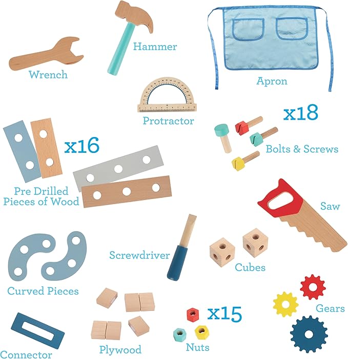 - Contents include: Work apron, hammer, saw, wrench, screwdriver, protractor, 18 bolts & screws, 16 pre drilled pieces of wood, 2 pieces of plywood, 2 cubes, 2 curved pieces, 15 nuts and 3 gears. Also includes a spinning turn saw, plywood with velcro to saw apart, a storage drawer and steering wheel