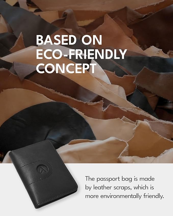 - Genuine leather passport holder:It is made from leather scraps.Making it an eco-friendlier choice. The high-quality full grain cattle leather material gives the wallet a sophisticated and luxurious feel, with durability, fine texture, soft and touch