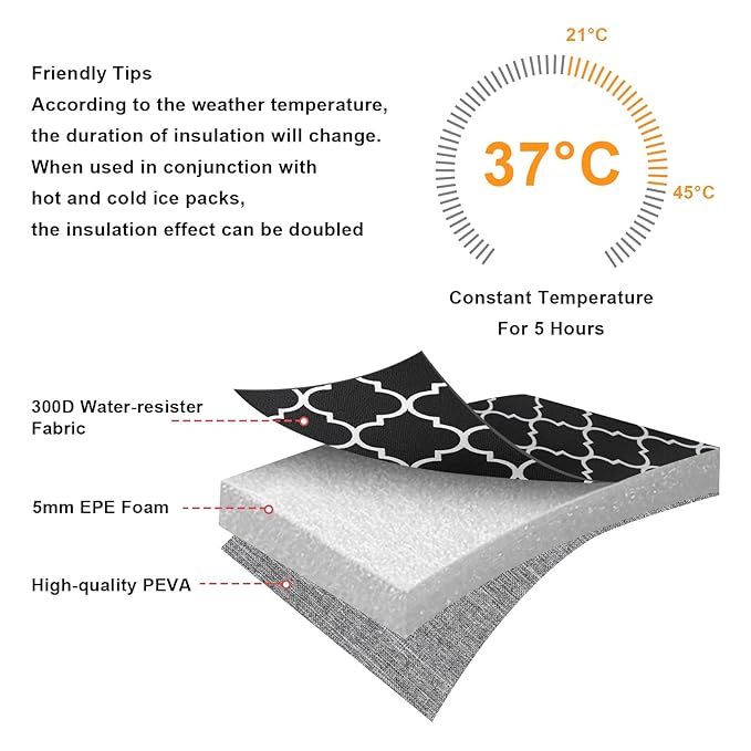 - Material : High quality water-resistant 300D composite oxford fabric, 8mm extra-thick EPE foam, Food-grade PEVA