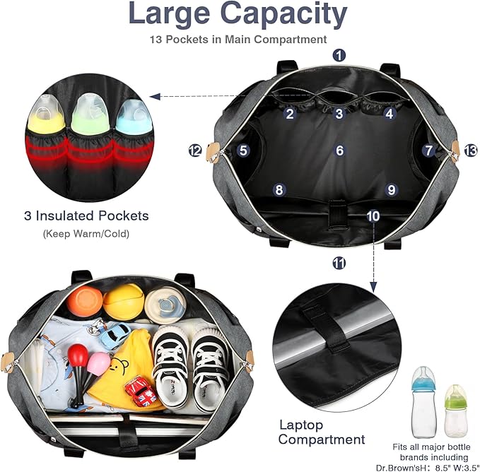 - Large Capacity & Multi-Pocket: Multifunctional pockets for newborn baby essentials including a main compartment, a front pocket, a back zipper pocket, 3 insulated pockets and 8 easy-access pockets inside for bottles, diapers, or wipes. Two sides pocket, wipes can be easily extracted from a hole in the outer layer. When you need to put something else, you can use velcro to prevent things from falling. Say goodbye to searching crazily in the bottom of your diaper bag for that one lost item.
