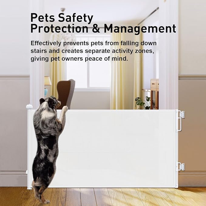 - New Safety Locking: The knob at the top of the mesh gate ensures that the retractable pet gate is easy to use for adults and can be opened and closed with one hand, while curious babies and pets will not be able to make any naughty bids for freedom. For best performance, remember to lock the latch after installation to fully tighten the mesh and ensure stability.