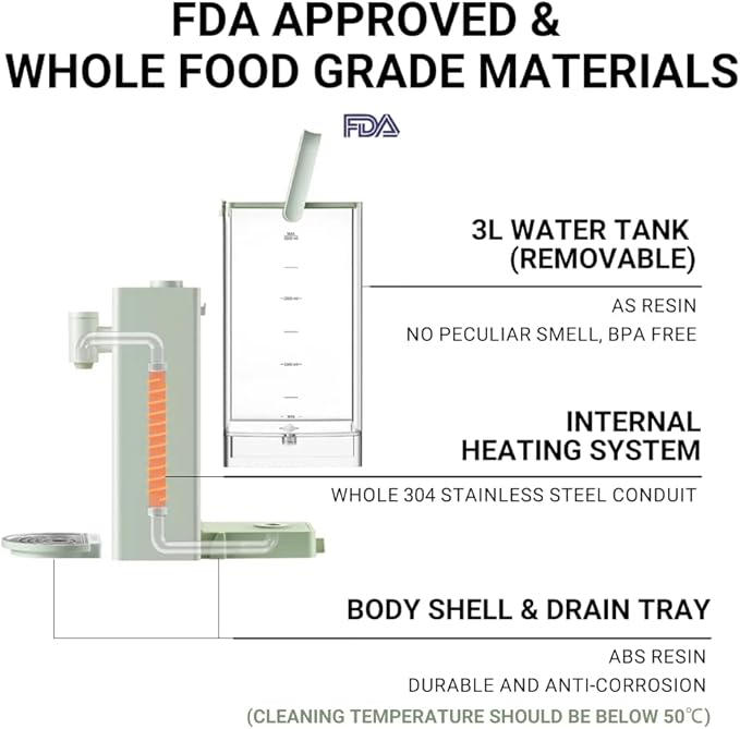 - HEALTHY MATERIALS & SAFETY CHILD LOCK - S9013 water dispenser has passed the FDA food grade test, every cup of water is safe for drinking. 3L water tank, body shell, draining tray are made of food grade AS, ABS resin, BPA free, durable and anti-corrosion; internal heating system is made of food grade 304 stainless steel conduit, ensuring water security. Safe child lock design can effectively ensure safety of children and pets at home.