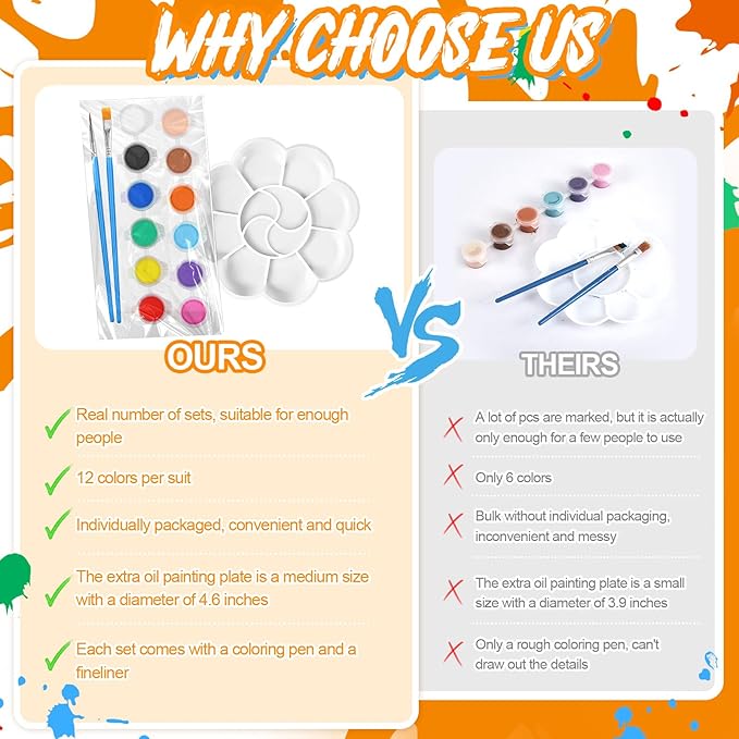 - Kids Painting Set: you will receive 24 sets of painting party favors for kids and adult beginners, which include 24 filled paint strips in 12 different colors, 48 paint brushes (24 flat brushes and 24 pointed brushes) and 24 palettes; All things fully meet the different needs of painting and coloring