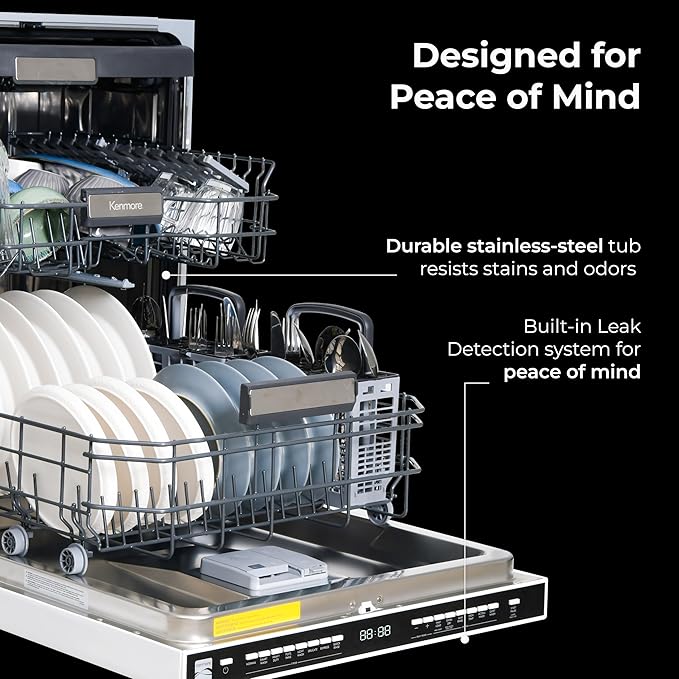 Kenmore 22-14629 24" Built-in Dishwasher-Quiet Tub with TurboDry, Leak, & SmartWash Soil Detection-15 Place Settings-49 DBA-Energy Star Certified, 24.61"D x 23.55"W x 33.88"H, Black