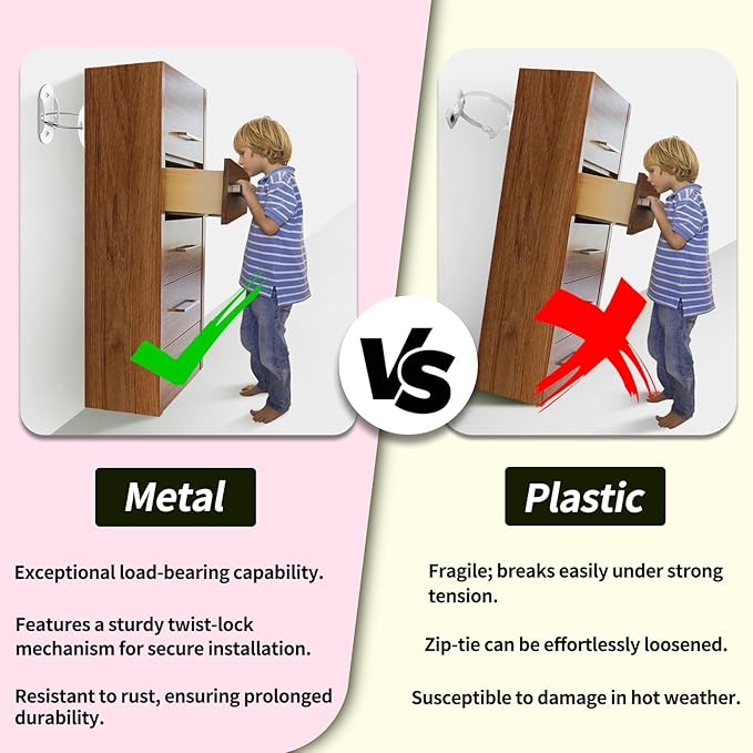 - Premium Material: Crafted from high-quality stainless steel, our baby-proof furniture anchors offer exceptional corrosion resistance and long-lasting defense against rust. Resilient against fire and heat, these anchors surpass plastic alternatives in durability, making them the ultimate guardian for your baby's safety.