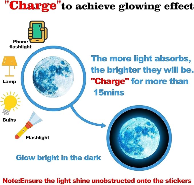 - Glow Like Crazy and Long Time: Our moon and star decals are beautiful,very realistic and glow like crazy,the brightness depends on the light it absorbs.you just need to put them under uv light,room light or flashlight for 30 mins.Note:Please ensure the light shines unobstructed onto the stickers.If you stick our moon for ceiling,please charge them with flashlight or room light before night,we also suggest you stick it close to the lights