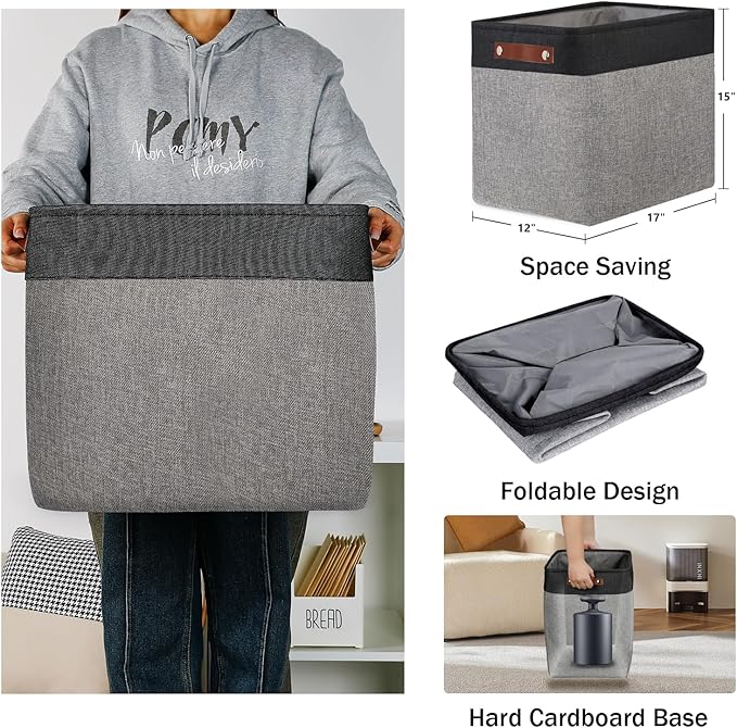 - 【Unique Design & Modern & Decorative】Set of 2 large storage baskets, dimensions(each): 17(L) x 12(W) x 15(H) inches. Collapsible storage baskets bring you organizing convenience and a sweet home. Great for socks, underwear, books, magazines, toys, baby clothes, pet products, wipes, towels, decorations, office supplies, DVDs, and gifts. The fabric baskets with neutral colors can match a lot of home styles - keeping your home nice and tidy.