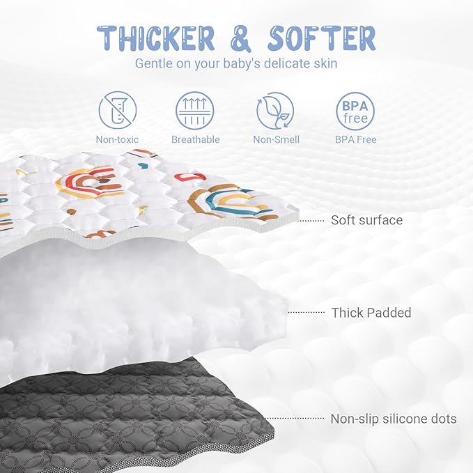 - 【Themed Design】The play mats for babies and toddlers designs with the unique boho rainbow pattern, matching colortful letters help improve children's cognitive skills. Cute floor mats for babies can make young children interested in exploring natural phenomena and help to stimulate their curiosity and imagination. you can use it in all sorts of infant activities, such as tummy time, crawling, learning to walk, playing and sleeping.