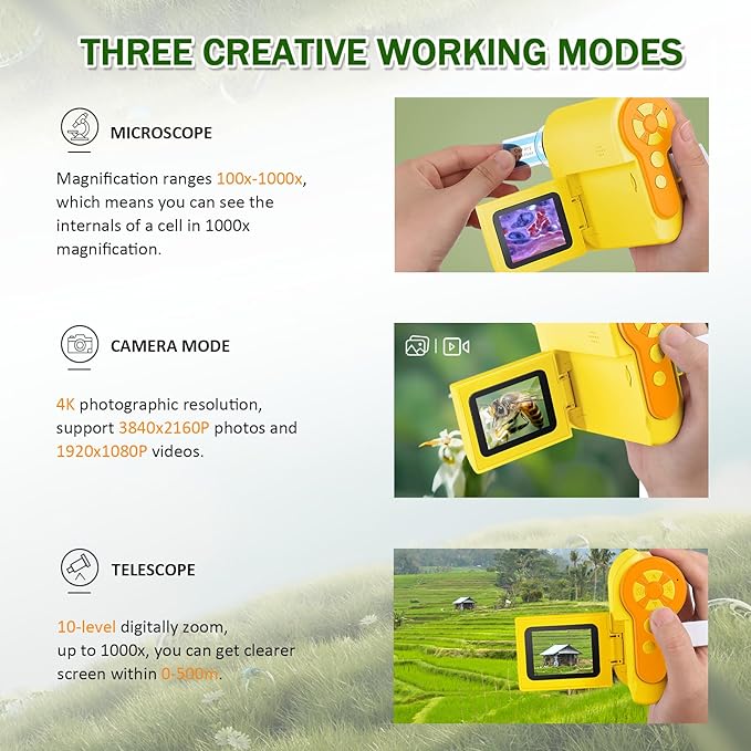 - 𝟯-𝗜𝗻-𝟭 𝗗𝗲𝘀𝗶𝗴𝗻: 1) Microscope Searching, 2) One-Click Photo & Video Recording, 3) Telescope, choose what you want to enhance child's learning experience. And this digital microscope made of 4K resolution, provides much higher clarity