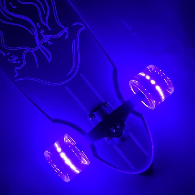 - Glow at Night: This longboard features durable light-up wheels that activate through motion, creating a visible trail during nighttime rides. With a balanced 70mm 78A construction, these ghost longboards glide smoothly on different surfaces. Its sleek build makes it ideal for those seeking clear long boards, whether for city cruising or relaxed outdoor use.