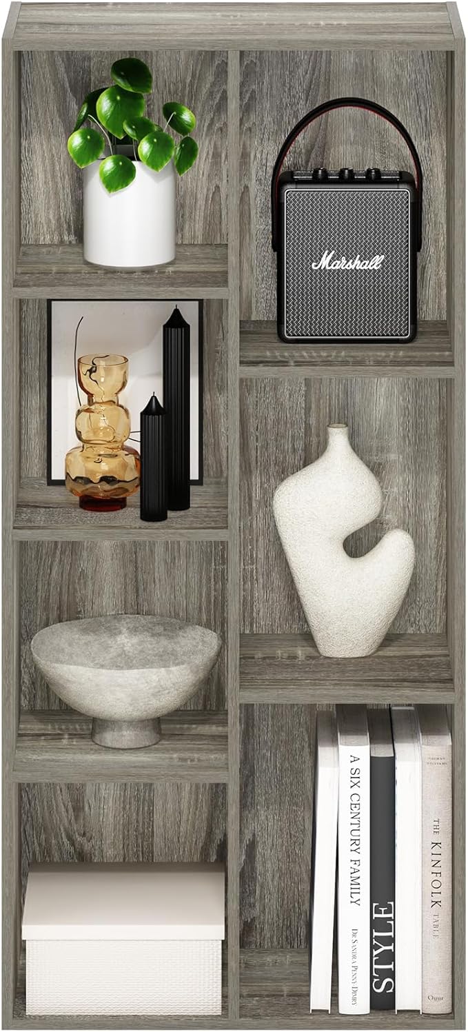 - Features 7 open shelves storage compartments of two distinct sizes offering versatility in display or storage options.