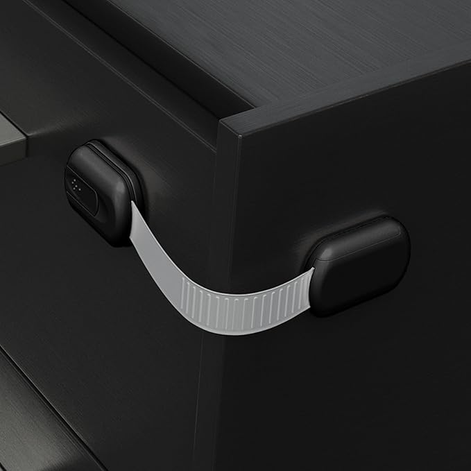 - 8 multi-purpose cabinet locks that has a high grade 3M adhesive. Flexible strap means you can bend around items from toilet seats to fridges