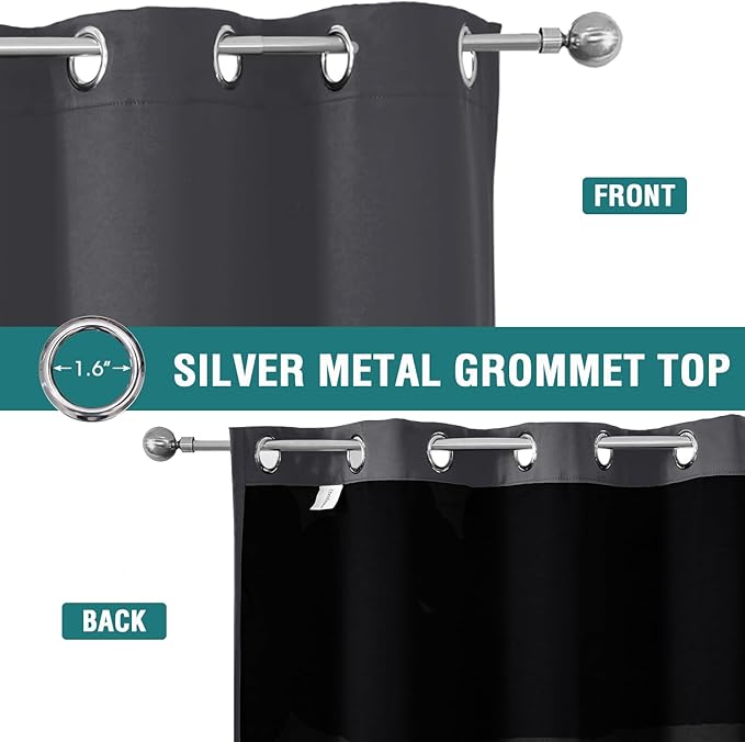- SET DETAILS: Set of 2 charcoal gray total blackout curtain panels per package. Each lined curtain measures 42 inch wide by 63 inch long with 6 silver metal grommets (1.6 inch inner diameter) on top, easy to install and slide.