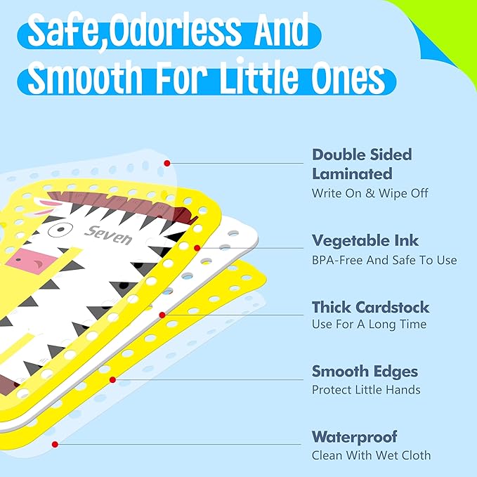- Double-sided Printing: One side of the card is an adorable animal in a number-shape, another side is the corresponding amount of this number (Especially explained the concept of zero). The patterns on cards are colorful, big and vibrant. The holes are clearly cut and easy for preschoolers to work with. The strings are easy for children to use and fit into the holes easily.