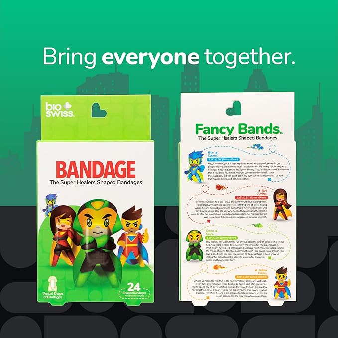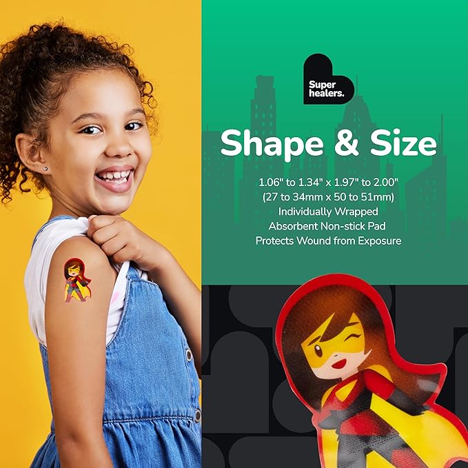 - SUPERHEROES BANDAGES: This 24 piece pack of Super Healers bandages feature fun Blue Cyprus, Red Amber, Green Onyx, and Yellow Falcon superhero shapes, and is great for putting a smile on kids' faces while protecting wounds such as cuts, scrapes, and burns; great for an epic first aid adventure, these sticky bandages come in a cute cardboard box and are perfect for kids and adults alike, and also for school nurses and pediatric doctors