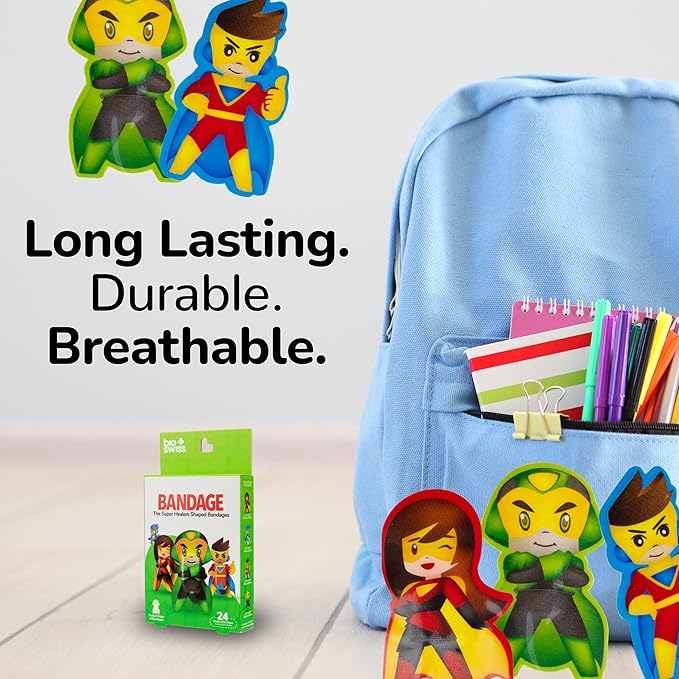 BioSwiss Bandages, Super Healers Superhero Shaped Self Adhesive Bandage, Latex Free Sterile Wound Care, Fun First Aid Kit Supplies for Kids and Adults, 24 Count