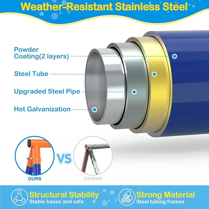 - Easy Installation and Weather Resistance: Setting up our swing set is a breeze with clear instructions and included hardware. The rust-resistant paint ensures reliable against the elements