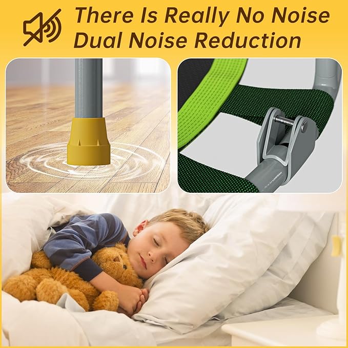 - 【SAFE AND FUN】 The padded handlebar is adjustable from 32.6” to 40.5” which fits your kid’s height perfectly. Kids can use the handlebar for easy grip to control their bounce. This springless trampoline is safer than the spring rebounders, primarily due to more soft parts. There is less of a chance of experiencing pinched fingers or toes, regardless of the safety precautions in place. Moreover, this trampoline has been added with a covering on top of the bands to provide safer jump pad surface