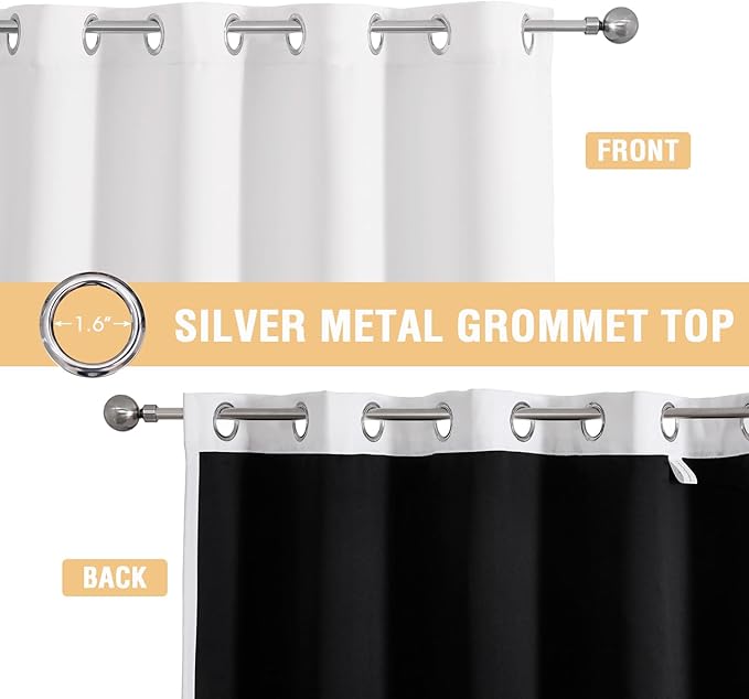 - SET DETAILS: Set of 2 total blackout curtain panels per package. Each lined curtain measures 42 inch wide by 45 inch long with 6 silver metal grommets (1.6 inch inner diameter) on top, easy to install and slide.