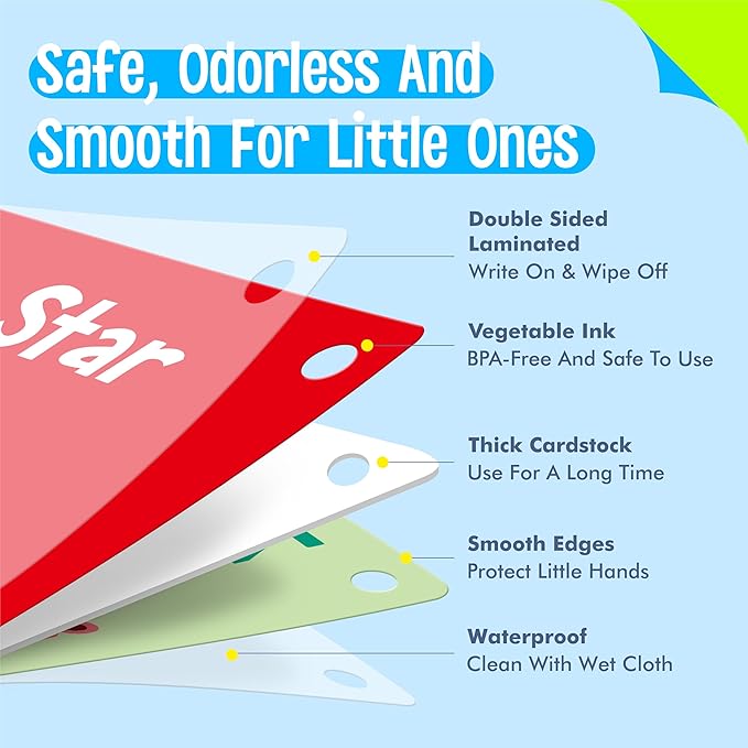 - Well Made: The card adopts sturdy and thickened paper material with PET film on both sides, durable and tear resistant. Printed with premium non-toxic vegetable oil-based ink, BPA-free and safe for kids to use. Bright colors and cute designs catch kids’ eyes and evoke a sense of excitement and joy. When children are surrounded by these colorful flashcards, they are more likely to be engaged and interested in what they are learning.