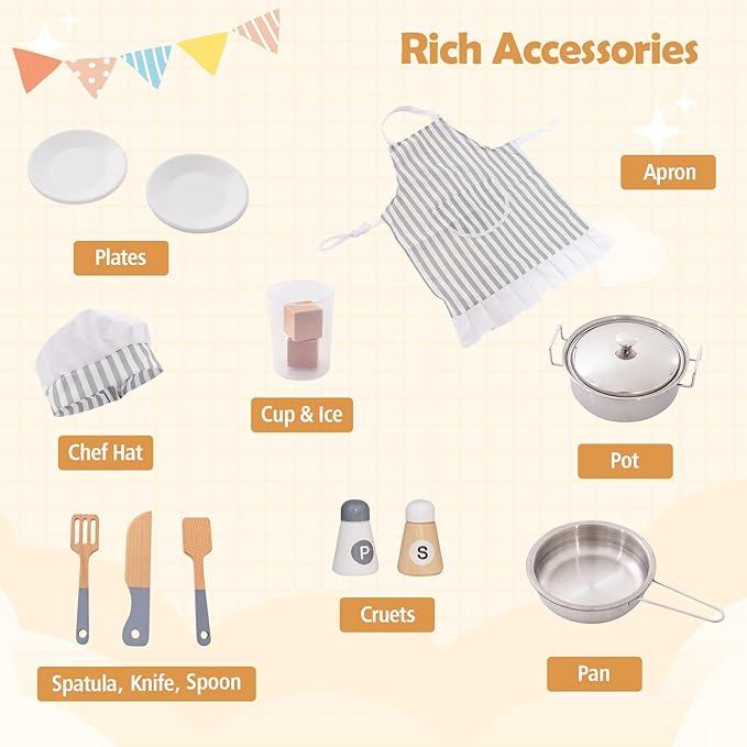 - Great Gift for Kids: This corner cooking toy set is designed for kids aged 3-10 who love to pretend cooking. The real cooking experience allows children to improve their hands-on ability, develop fine motor skill, inspire creativity and more during play. This toddler kitchen toy set is the perfect gift idea for any occasion.