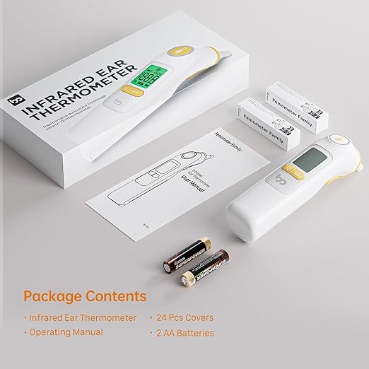 - Included Components : 1×Ear Thermometer, 2×AA Batteries, 24×Probe Covers, 1× Storage Bag, 1×Manual