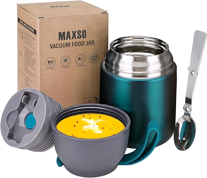 Insulated Thermo Food Jar for Hot & Cold Food for Kids Adult, 17 oz Soup Thermal Hot Food Containers for Lunch, Triple Layer Insulation Stainless Steel Food Jar with Spoon (Green)