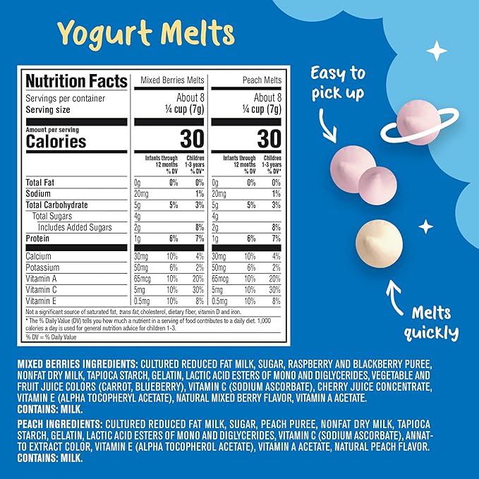 - Yogurt Melts Freeze-dried yogurt snack made with real fruit (2) Mixed Berries Naturally flavored with other natural flavors (2) Peach Naturally flavored with other natural flavors