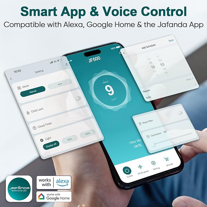 - Smart Control for Your Home: Our air purifier for bedroom seamlessly integrates with your smart home devices. Use the app or your voice assistant to control settings, monitor air quality, and enjoy convenient management from anywhere.