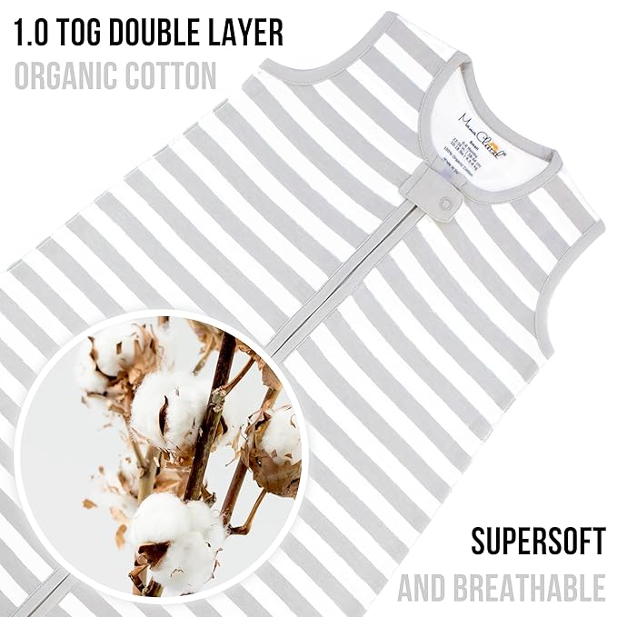 - 【DOUBLE LAYER 1.0 TOG 100% Organic Cotton】— This Baby Sleeping Bag is made of double layer premium organic cotton with a TOG rating of 1.0, which is most suitable for moderate seasons or climates, can help your baby get a peaceful, long sleep year-round being not too hot or cold. The organic cotton interlock makes sure that overheating will not occur and keeps your baby warm and comfortable.