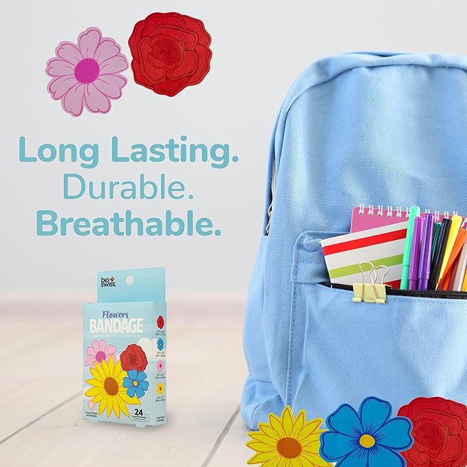 BioSwiss Bandages, Flowers Shaped Self Adhesive Bandage, Latex Free Sterile Wound Care, Fun First Aid Kit Supplies for Kids and Adults, 24 Count