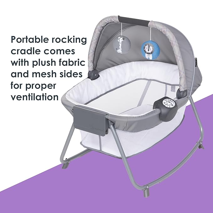 - Includes removable and spacious portable cradle with rocking and stationary modes; Portable rocking cradle comes with canopy and carry handle, plush fabric and mesh sides for proper ventilation, and two plush hanging toys to encourage grasping and reaching