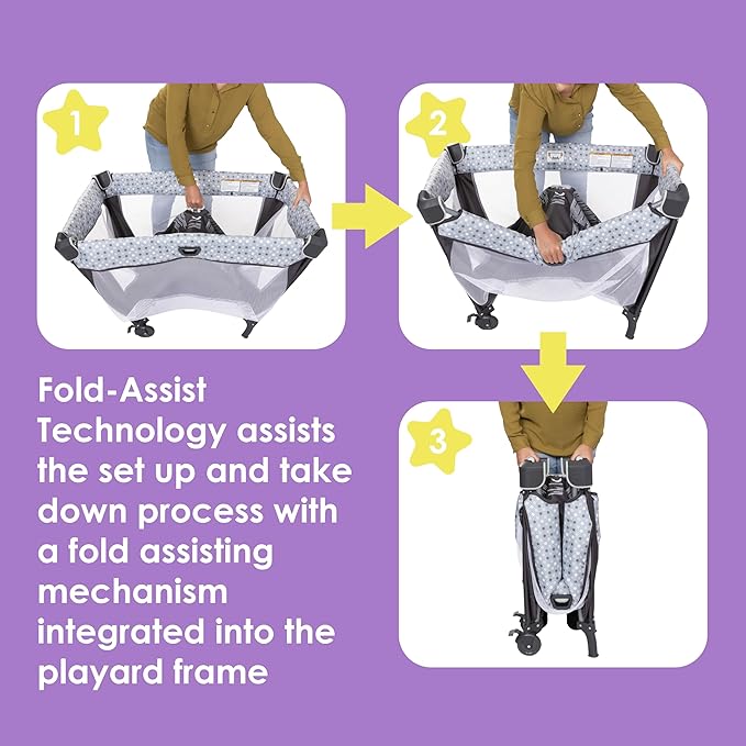 - Fold-Assist Technology assists the set up and take down process with a fold assisting mechanism integrated into the playard frame