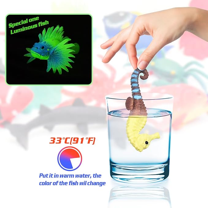 - Color Changing Toys: These sea creatures toys for kids magically change colors in warm water above 91.4 F(33 C). When placed at room temperature or refrigerated, fish toy returns to its original color.