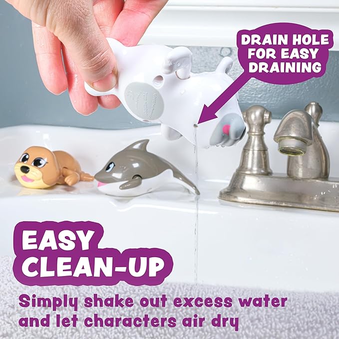 - EASY CLEAN-UP: When the fun is done, simply shake out any excess water and let air-dry. Each wind up bath toy includes a recessed drain hole to make it easy to shake out any water that gets in.